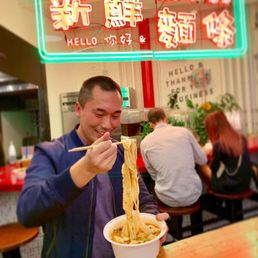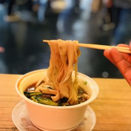 Happened upon Very Fresh Noodles when I found myself in Chelsea Market. The long line had me intrigued, but the plates of noods on the tables around me sealed the deal. Wait time was about 20 mins but man these noodles were worth every second. Noodles are thick, hand pulled, and delicious. The lamb is well seasoned however I like spicy foods, so I felt like it could've definitely had some heat added to it for a real kick. There's limited seating with views into the kitchen so you gotta be quick/lucky to grab one but the service is friendly and fast once you order. Overall I'd definitely return for sure. If you give em a try, Happy eats folks!